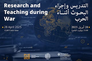 You are invited to a webinar discussion on "Research and Teaching during War." The session will take place on April 28 at 8 am EST / 3 pm Cairo.